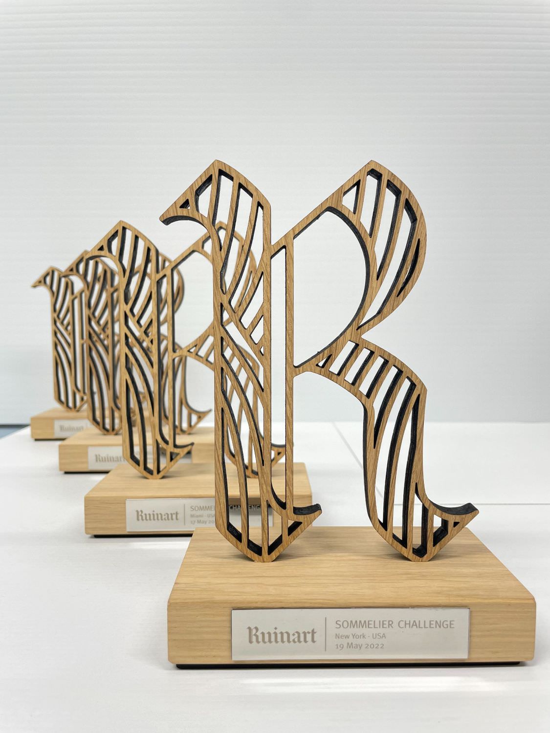 Trophées en chêne massif avec plaque personnalisée en métal couleur chrome gravée pour une grande maison de champagne à Reims